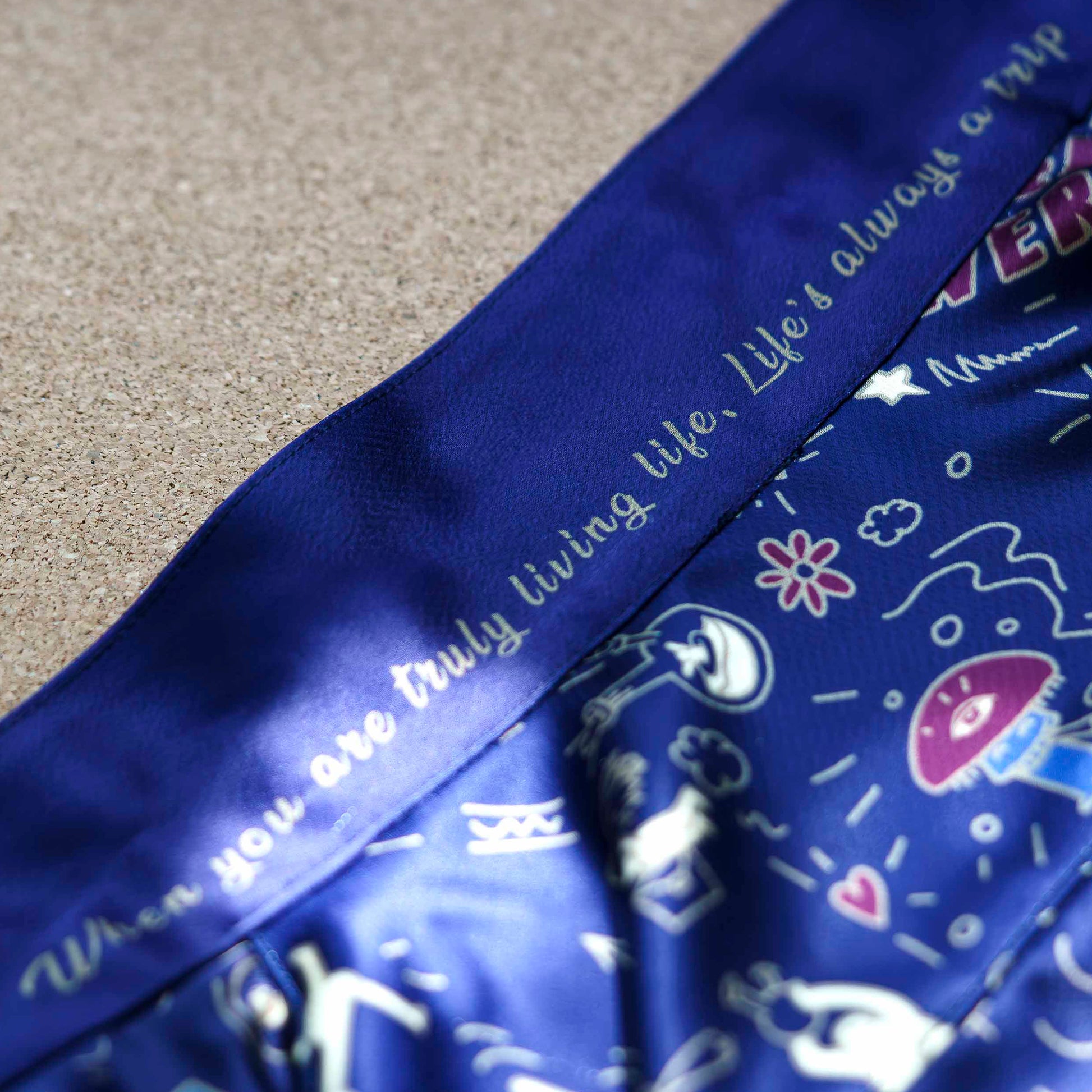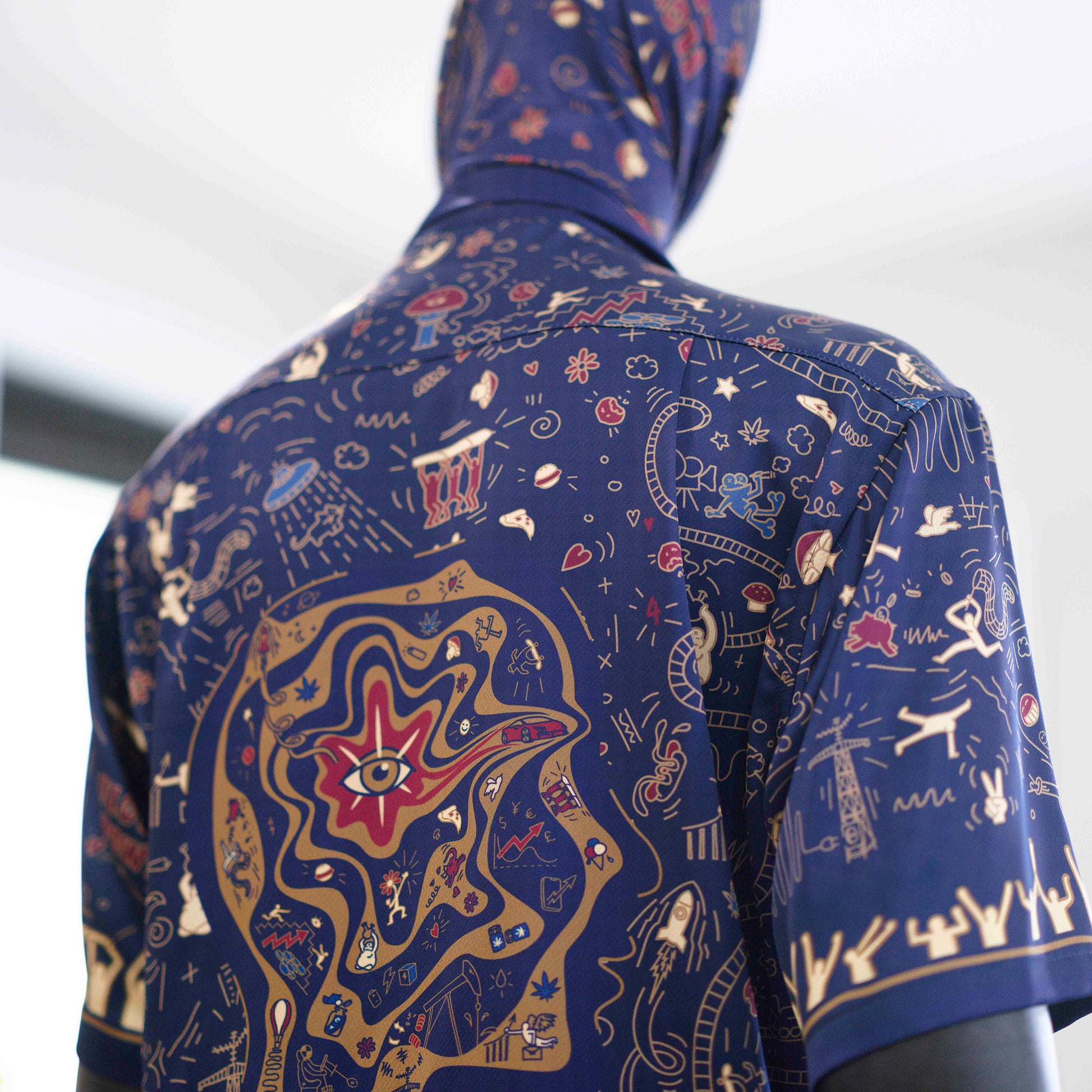 The Mind Trip shirt exemplifies luxury through its striking graphic contrasts, embodying the dualities synonymous with our brand. Crafted from premium silk, this garment features a sporty oversized cut, distinctive Cuban collar and a bespoke collar button. The design is elevated by our exclusive Mind Trip print, which contrasts dynamically with distinctive design. Reflecting a perfect blend of elegance and humor.